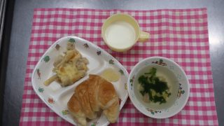 今日はクロワッサンです🥐✨みんな嬉しそうにパンを頬張っていました~(*^-^*)💕根菜のグラタンは味噌味になっていてこちらも大人気でした~✌✨ みんな元気にもりもり食べてくれました~(^-^)✨