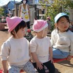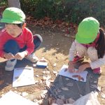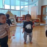 今日はお部屋で絵の具に触れました。保育士が画用紙に絵の具を乗せて指先でぐるぐると伸ばして見せると興味津々で見ている赤ちゃん達。一人ずつに画用紙を配り絵の具を乗せると早速指先で”ちょんちょん”とつっつくようにして触れたり、伸ばして線を描いたりしている子もいました。手に着いた絵の具を見て”ついちゃったよ~!”と驚いている子もいました。保育士の持っている筆を真似して持っている子もいましたよ(^^♪