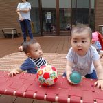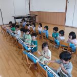今日は、お部屋で紐通しとボタンはめグループに分かれて遊びました☆紐通しでは、紐を2本の指でつまみ真ん中の穴に通し、出てきた紐をそーっと引っ張っていました。コツがつかめるとすいすいと何個も通していくありんこさんでした(*^-^*)ボタンはめの方が難しいようで、一つ一つ時間を掛けて挑戦していました。自分のパジャマのボタンはめや保育士のエプロンのボタンにチャレンジしているお友だちもいました。