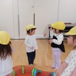 お部屋に戻ってからはちょうちん制作の続き💨 前回作った染め紙の上下の部分に黒の画用紙を貼り付け、くるくるっと丸めるとあっという間にちょうちんの形に!! 先生が試しに懐中電灯で中から照らしてみると、「わぁ~!光ったー!!」「きれい~✨」と大喜びでしたよ♪
