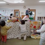 いつも遊んでいる2階ホールがいきものワールドに変身!!目の前に広がる昆虫の世界に大喜びのありんこさん☺あおむしとダンゴムシのトンネルや蜘蛛の巣をくぐったり、あおむしのすべり台をすべったり、大きなてんとうむしやバッタ、ヘラクレスの乗り物など楽しんで遊んでいました。ありんこの巣では卵を転がしたり、池でお魚を釣ったり、ちょうちょの羽をつけてちょうちょに変身したり昆虫の世界をとっても満喫して遊んでいましたよ。