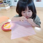 おやつ後、そのままシール貼りをしました☆保育士が画用紙を切っていると待ち遠しい子どもたち♪画用紙とシールが手元にくると台紙からシールを剥がし、画用紙に貼っていました!傘のシールを見て「あめ(今日)」とお話する子も!シール貼りの後は、お絵かきをしました✎後半は、畳のところでアンパンマンの音の鳴るおもちゃで遊んだり、ゴロゴロと横転をしている子もいました。