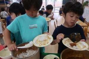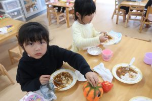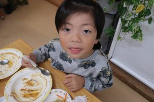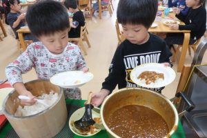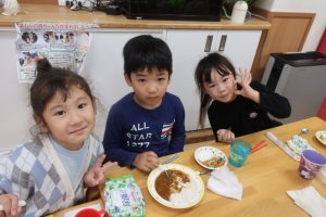 給食室からのにおいをかぎつけて、今日はカレーでしょ?!っとニコニコしながらみんなやってきました(^^♪