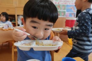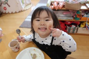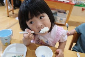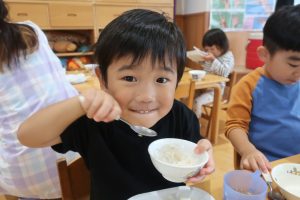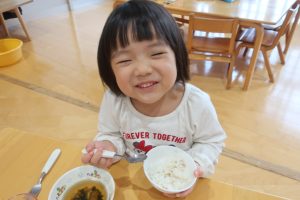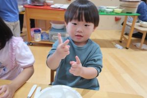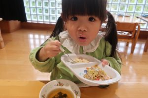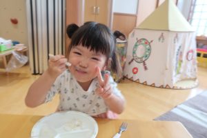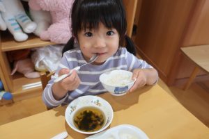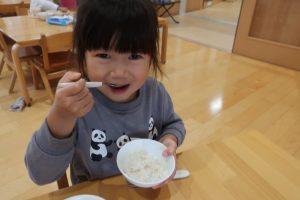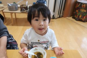みつばちさん!!食器を移行しました(^^)/プレート皿からお茶碗、幼児用のおかず皿に移行しみんなとっても上手に食器を持って食べていました✨嬉しそうな表情をご覧くださーい😋✨✨
