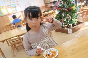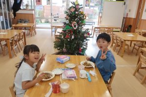 今日は、大人気のカレーライスの日でした✨☺️✨お腹が空いて早くに来るお友だち、お外がぽかぽかでもう少しあそびたいお友だち🎵皆それぞれ自分でのペースで来ていま~す☺️💕クリスマスツリーの前での可愛いショットがとれました❤️