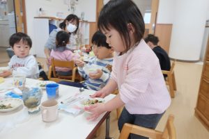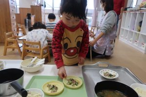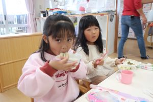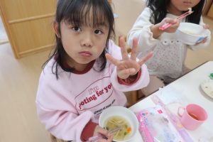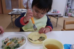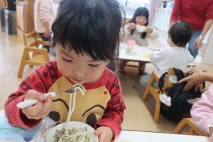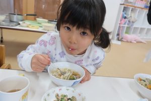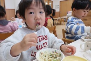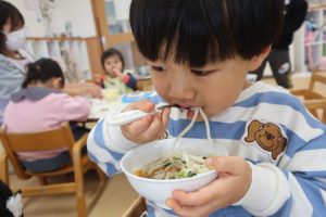 今日は小雪がちらつく中、子どもたちは元気いっぱい園庭で遊んでいました!(^^)! お昼にはもうお腹がペッコペコ!!さぁ~あったかいうどん食べよう~ヾ(*´∀`*)ノ