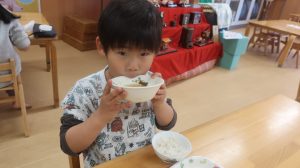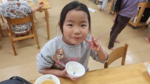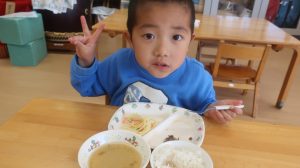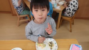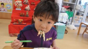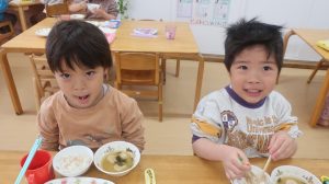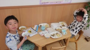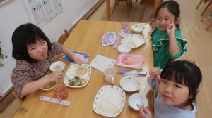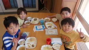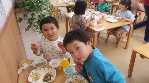 とんぼさんで仲良く給食を食べました(*^-^*)チンジャオロースもスパゲッティサラダもみんな美味しいっとモリモリ食べてくれました✨