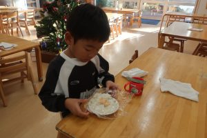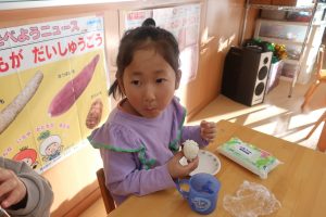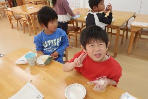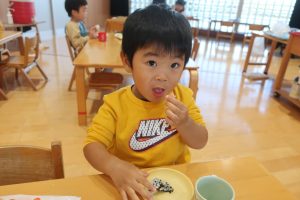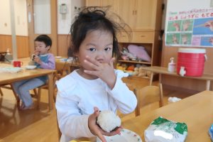 今日のおやつはかぶとさんのリクエストの「おにぎり🍙」でした~!!2歳クラスのお友だちからは自分で握り、海苔を巻きました~✨みんな上手に握れていました👏!!