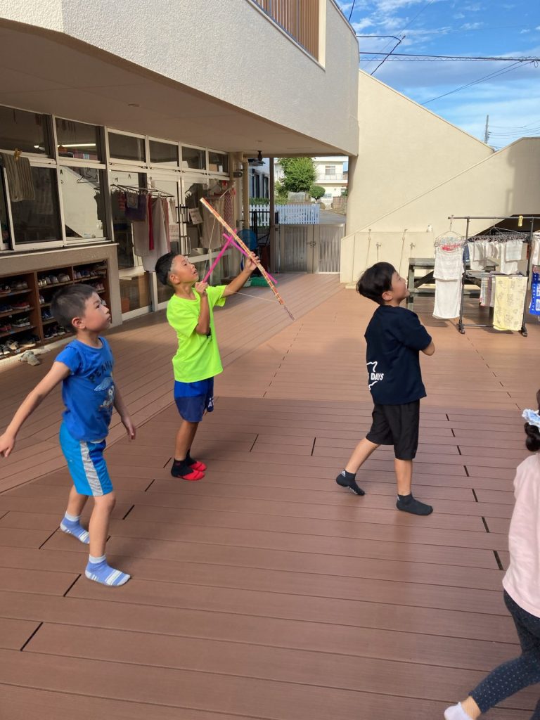 犬久保公園では鬼ごっこ、野球、ブランコ等をして遊び、テラスでは紙飛行機や弓矢を飛ばしたり、大縄跳びなどをしたりして遊びました!