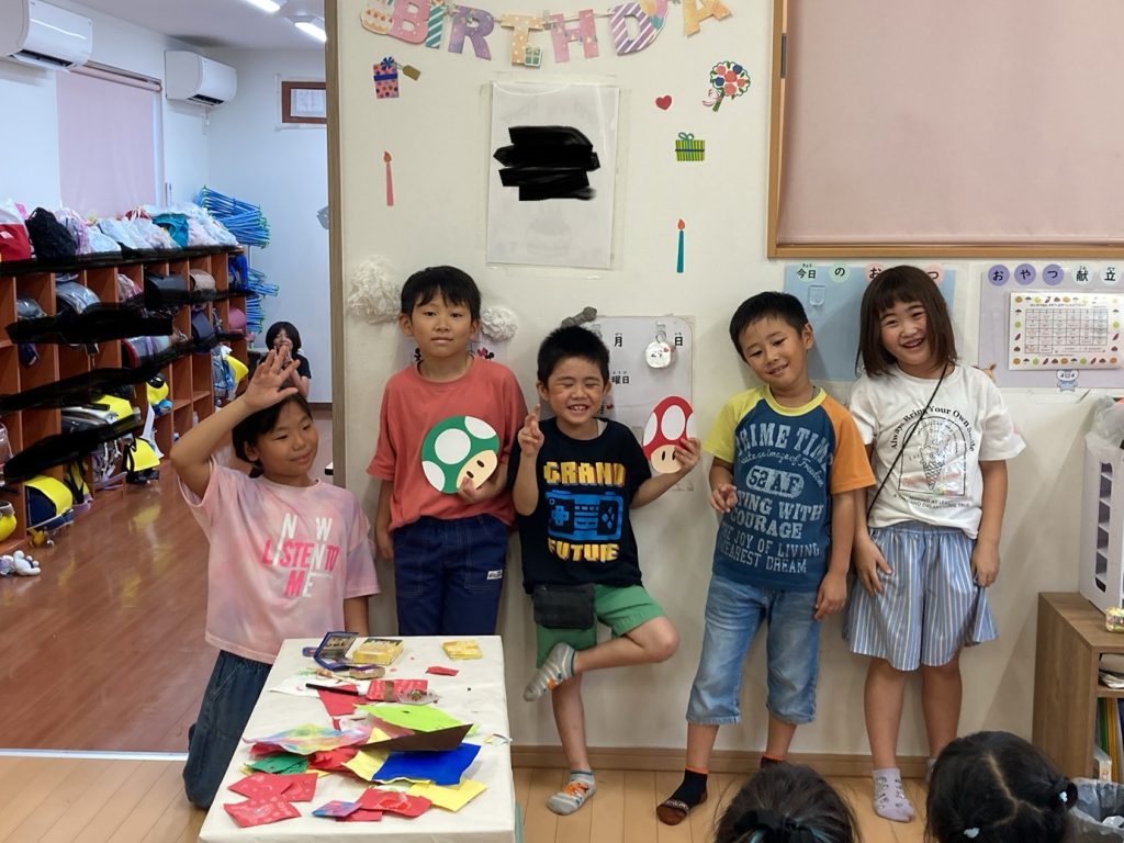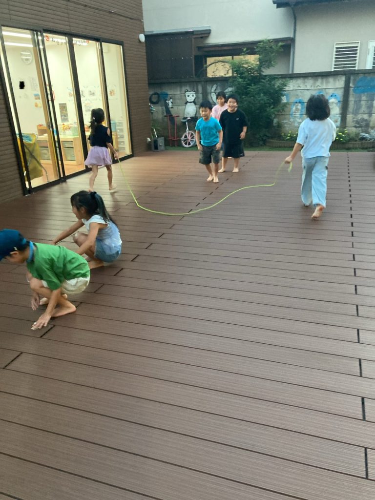 おやつは、「ジュース」と「ワッフルケーキ」でした!みなさん美味しそうに食べていました♪誕生会では、「ワードスナイパー」をしました。とっても盛り上がりました!誕生会をした後は、お部屋と犬久保公園に分かれて遊びました。お部屋では、ピアノ、LEGO、トランプ、折り紙、色画用紙工作、読書等をして過ごしました!犬久保公園では、サッカー、鬼ごっこ、野球、ブランコ、砂遊びをしました!テラスでは、トランポリン、大縄跳びをして楽しみました。