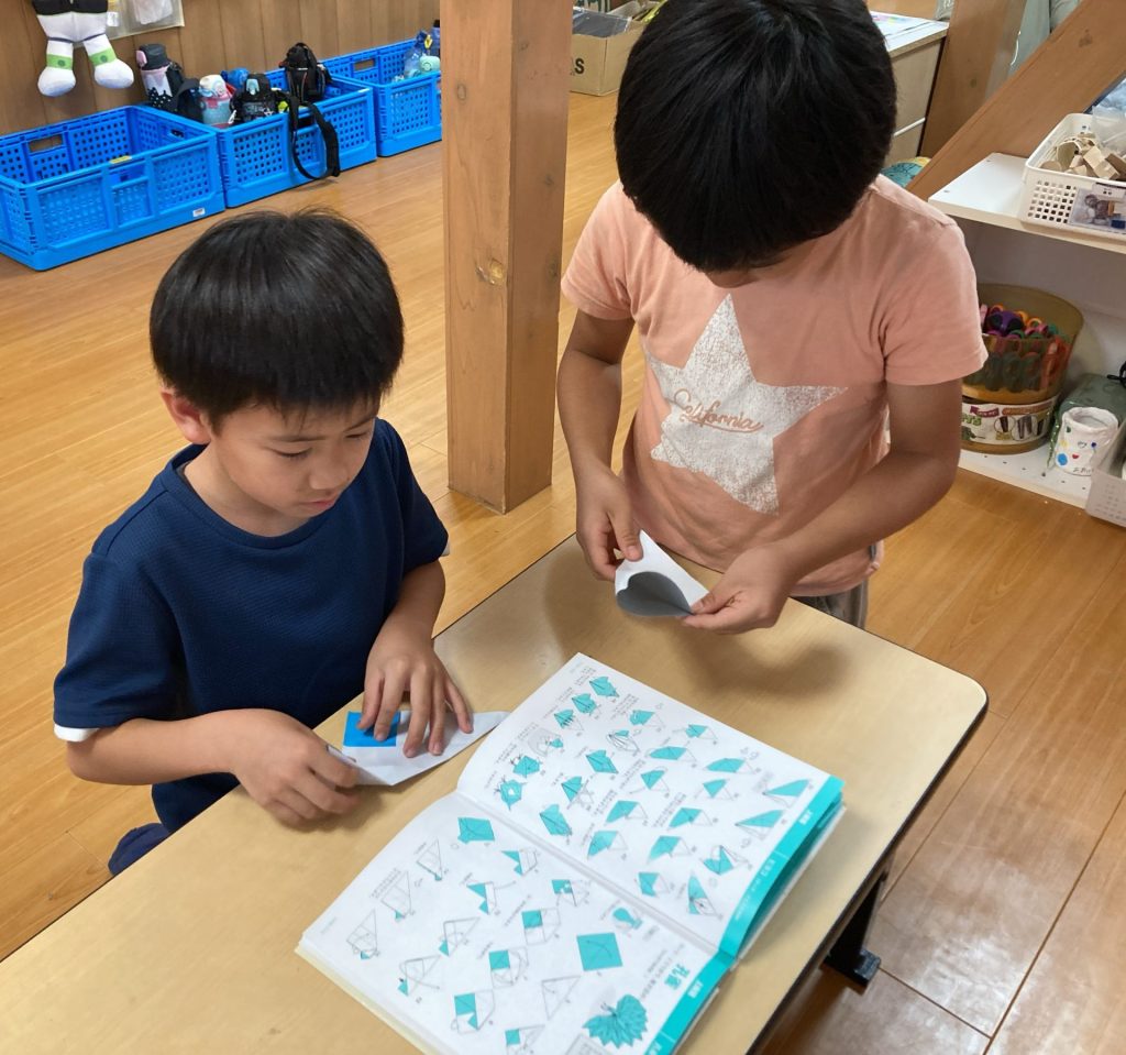 プラ板製作、人形作り、折り紙では、折り紙の本とにらめっこ! 発表の練習もしています。