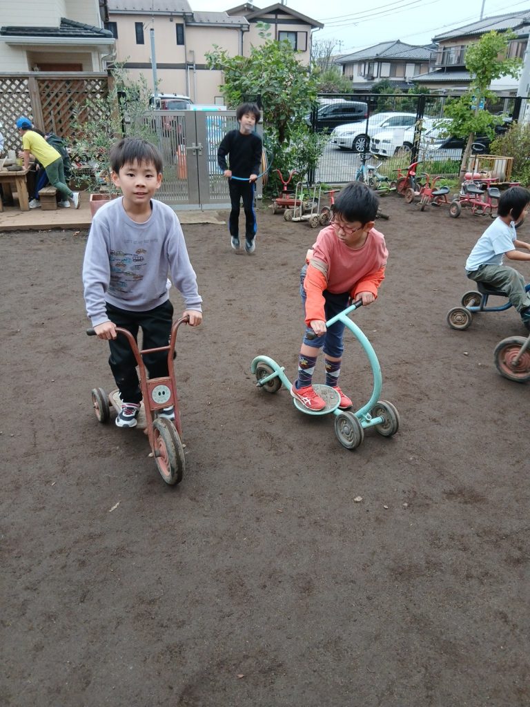 夕方は犬久保公園・園庭では鬼ごっこ、ドロケイ、ブランコ、サッカー、三輪車、バドミントンなどをして遊びました。お部屋ではレゴやダンス、ビー玉コースター、読書等をして過ごしました。
