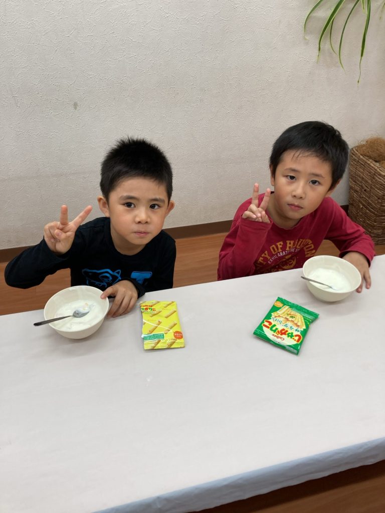 おやつはヨーグルトとじゃがりこでした。夕方は犬久保公園で鬼ごっことブランコ、サッカー、バドミントンをしました。園庭とテラスでは、三輪車や鬼ごっこ、ホッピング、トランポリンをして遊びました!