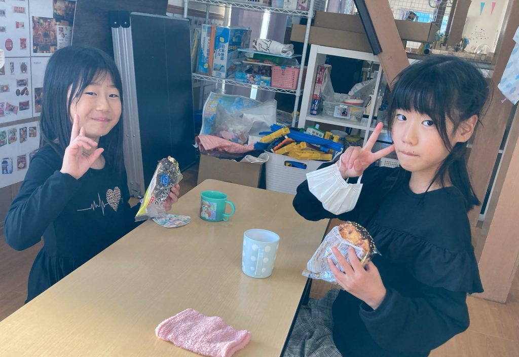 3年生以上は6時間授業、登所後はおやつを食べ宿題ををしていました。