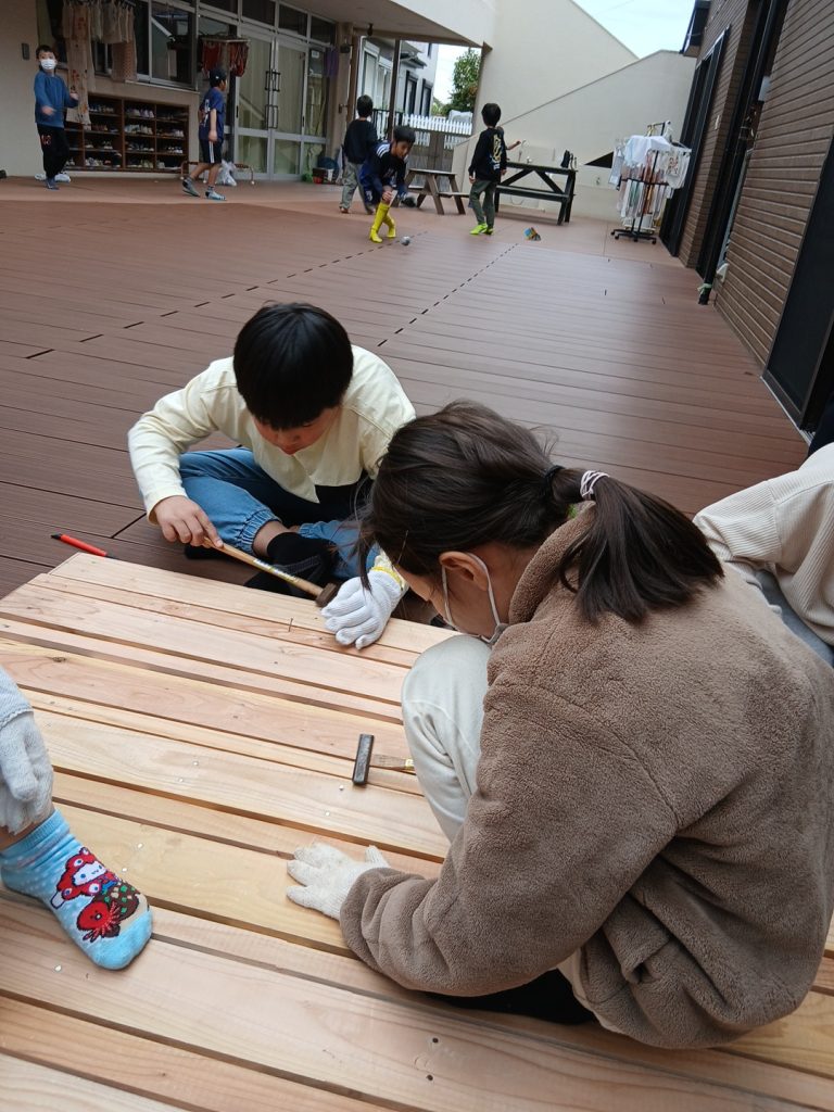 今日は灰色の雲が空を覆い、朝からヒンヤリとした肌寒い一日でしたがクラブに来ている子は風邪も治り、元気いっぱいで帰ってきました。運動会の延期により時間割も変則的になっており、1~4年生は4時間授業、5・6年生は5時間授業での登所となりました。1~4年生は早々に宿題を終わらせ、お部屋の中でレゴや段ボールハウス作り、テラスで紙玉野球やスノコ作り等をして過ごしました。