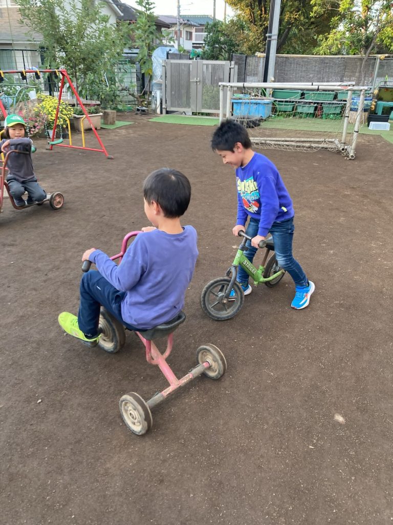 夕方は園庭・テラスでフリスビードッジ、三輪車、バスケットボール、砂遊び等をして遊びました。