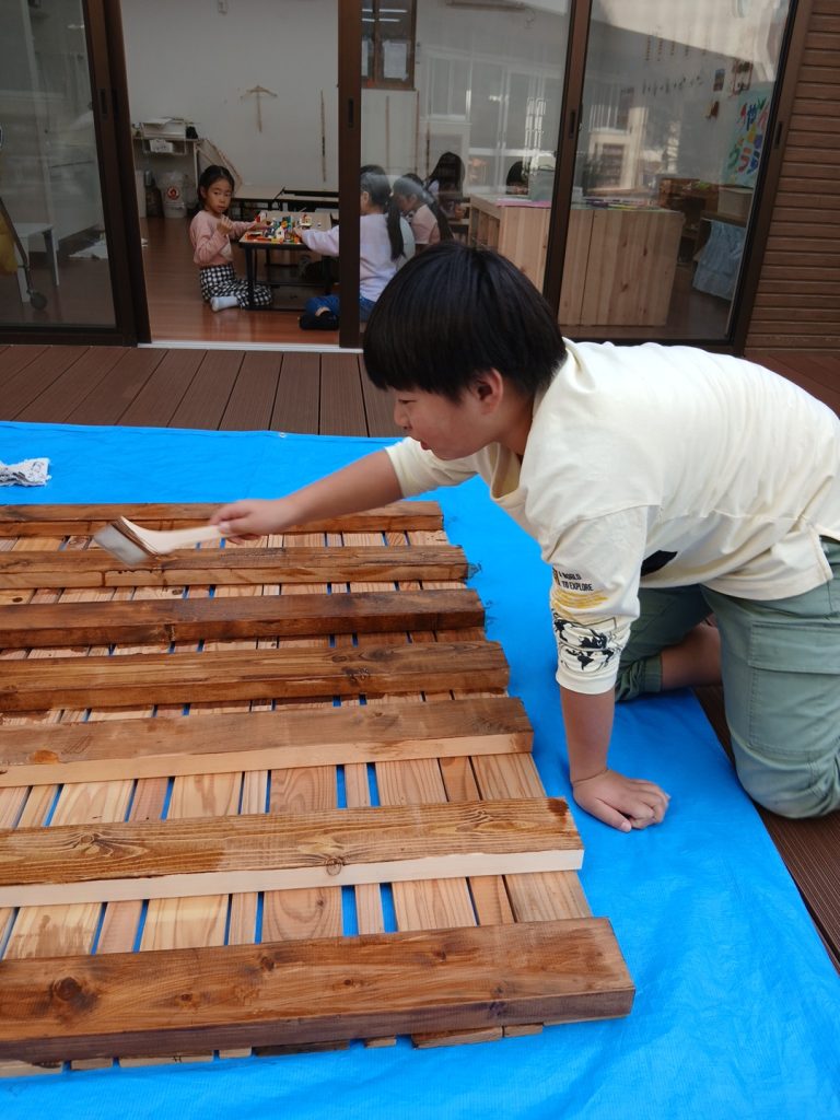 釘を打ったスノコに防水塗料を塗りました!服や肌に付かないように気を付けながら作業しました!