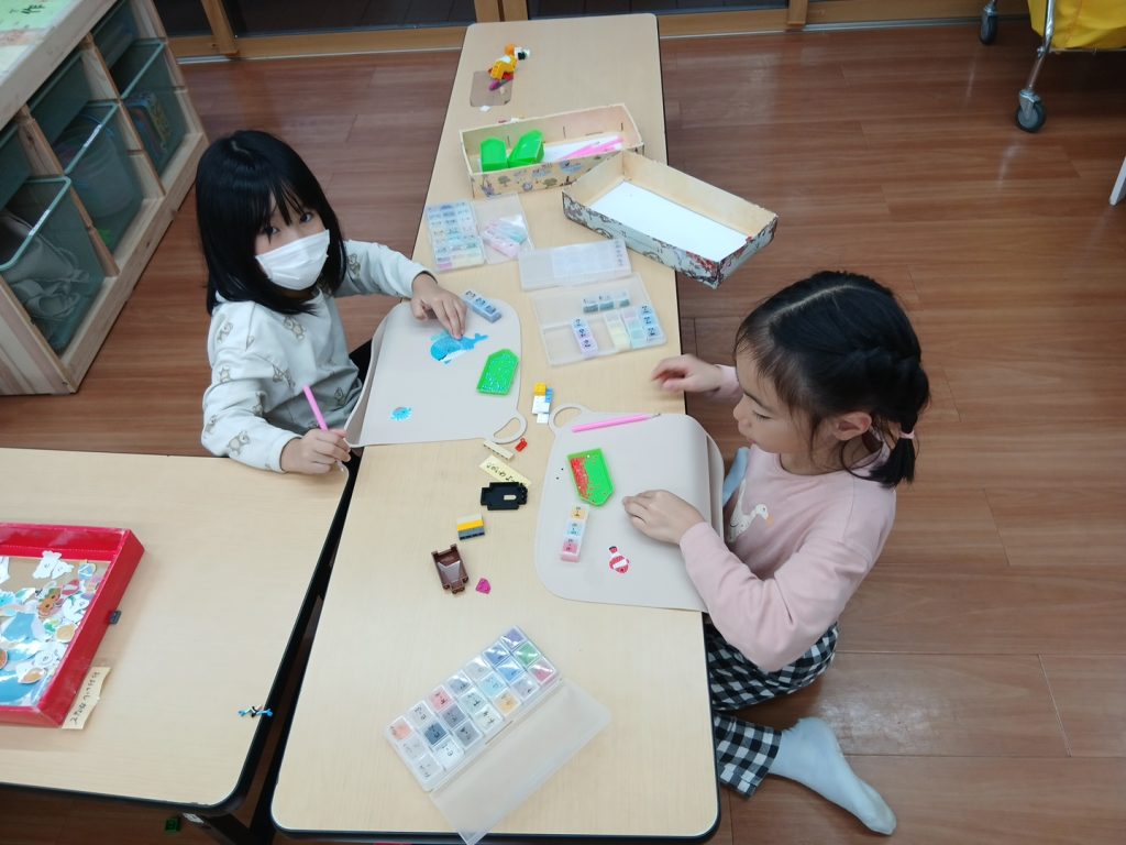 夕方はお部屋でレゴやピアノ、段ボールハウス作り、読書、ビーズアートをして遊びました。また、園庭・テラスではフリスビードッジや野球、三輪車、バスケットボール、鉄棒等をして遊びました!