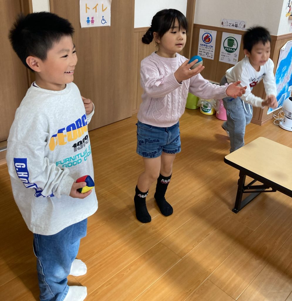 お手玉・ボードゲーム・ピアノ・コマ回し・レゴブロック・等々で遊んでいます。