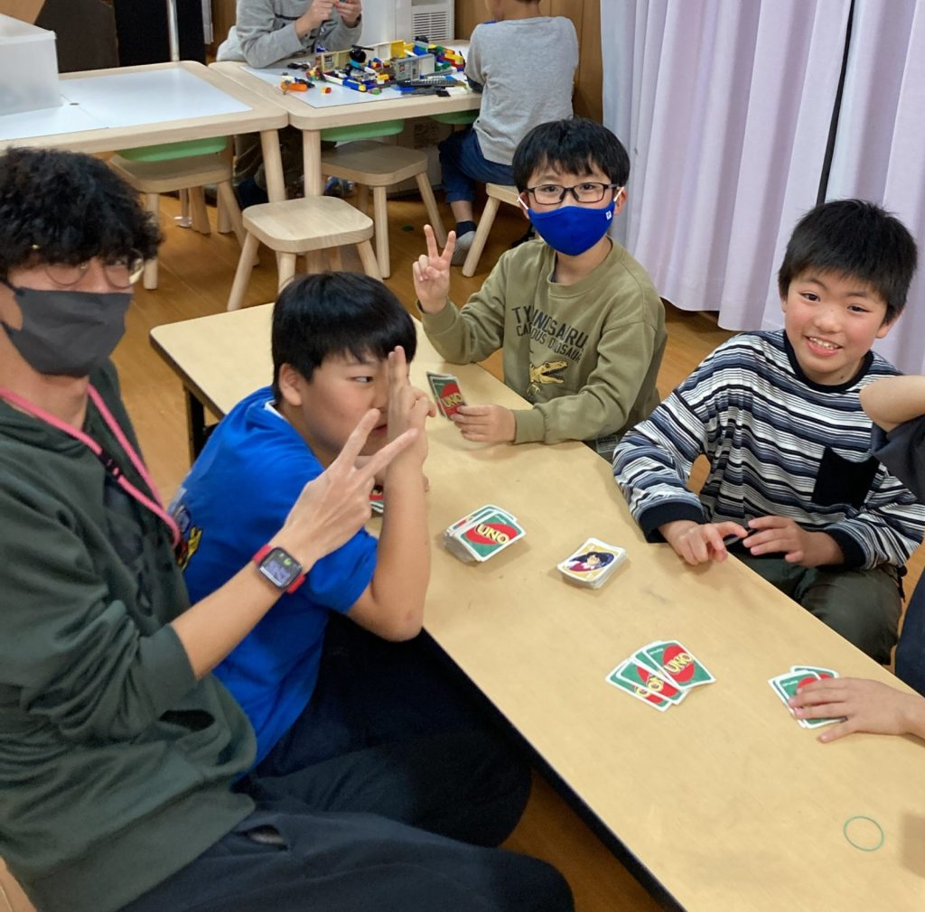 クラブではUNO、木工ブロック工作、お絵描き、迷路、レゴブロック、ラキュー、などで過ごしました。