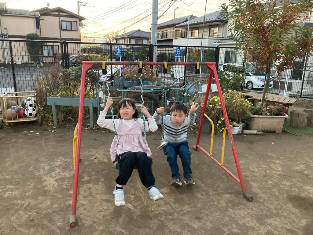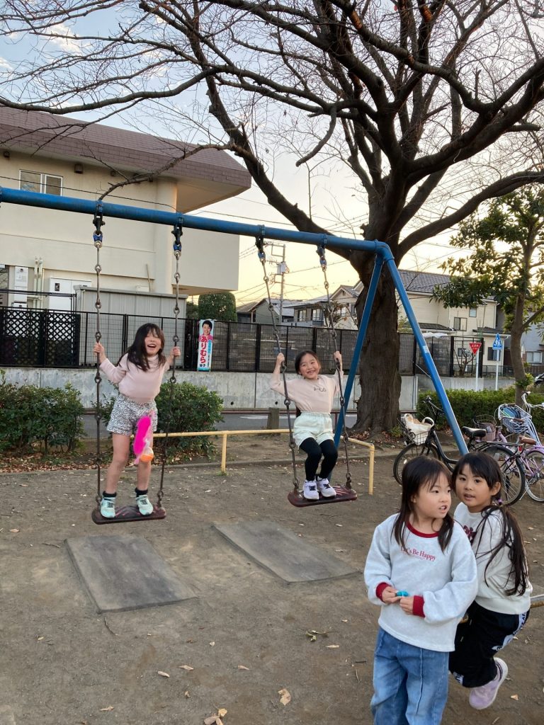 夕方には犬久保公園・園庭・テラスでサッカーや鬼ごっこ、ブランコ、三輪車、バスケットボール、野球などをして遊びました。