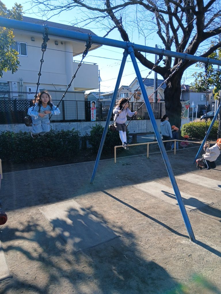 おやつでランチパックを食べて犬久保公園と園庭に行きました。公園で鬼ごっこやブランコ、バドミントン、園庭でバスケや三輪車、フラフープ、ブランコをして遊びました♪