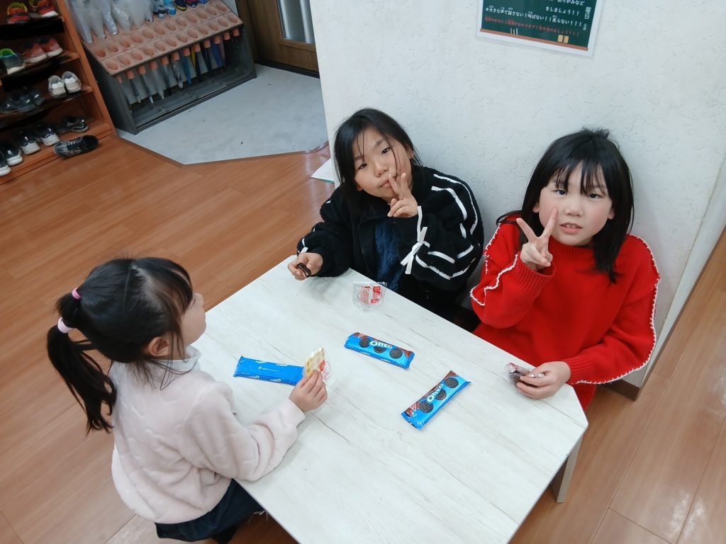 1月もあっという間に終わってしまいましたね。今日は、15時頃に、少しだけ雪がパラついていましたね。みなさん、「雪だー!!」「雪が降っているよ!」と雪に大興奮でした!テラスに出たり、お部屋の窓から雪を見たりしていました⛄今日のおやつは、「ソフトサラダ」と「オレオ」でした🍪おやつ後は、犬久保公園・園庭・テラス、お部屋に分かれて遊びました。体調不良のお友達が増えています。体調に気を付けてお過ごしください♪