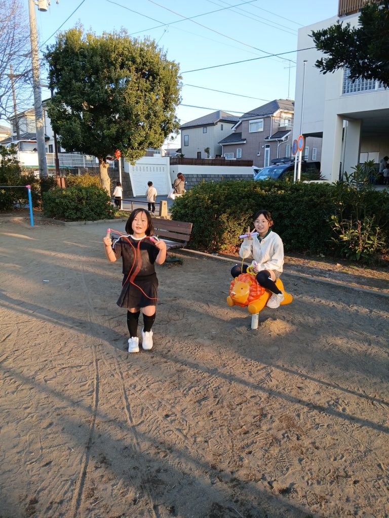 おやつはコアラのマーチやオレオ、お煎餅を食べました。夕方はみんなで犬久保公園に行きました。サッカーや鬼ごっこ、縄跳び、ブランコをして楽しかったですね!園庭でも縄跳びをして遊んでいました♪今日は暖かくたくさん遊べましたね😊