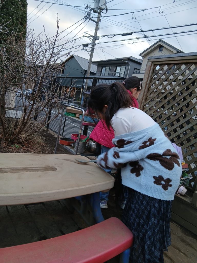 園庭に戻ってきてからは三輪車やおままごとをしました。おままごとは定食屋さんと駄菓子屋さん。肉じゃがやカレーときれいに盛り付けをしていましたが、何より店じまいのお片付けがチームワーク抜群でした😊さすが小学生ですね!