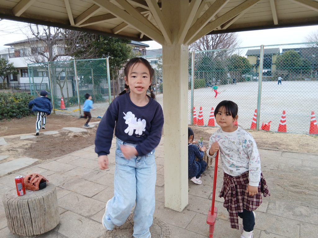夕方には犬久保公園・園庭・テラスでブランコ、鉄棒、サッカー、キャッチボール、鬼ごっこ、木登り、ホッピング、ままごと、三輪車、バスケットボールなどをして遊びました。