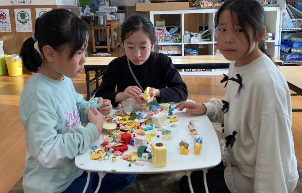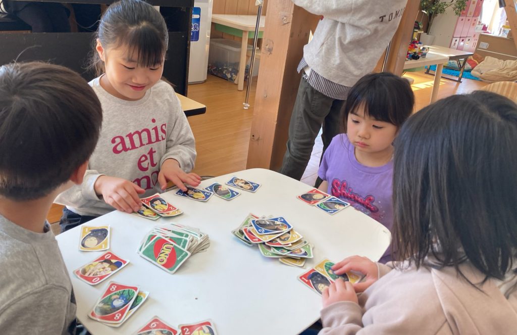 お部屋では、ウノ・カードゲーム・段ボール工作・コマ回し・レゴブロック・クイズ大会・ミニチュア玩具などで友達と遊びました。