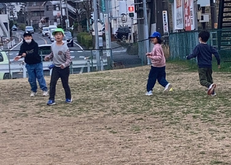 おやつ後は緑の広場とお部屋に分かれて遊びました。緑の広場では「ドッジボール」で遊びました。