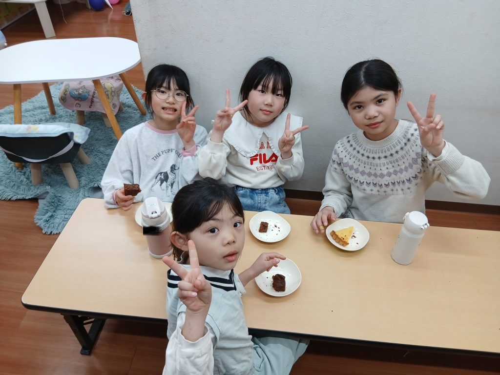 寒い日が続きますね。今日は、みなさん4時間授業で帰ってきました。宿題を終わらせてから、犬久保公園に行きたいお友達は、遊びに行きました!遊んで、身体を動かしたら、「あついよ」と言いながら、寒さに負けていません☆おやつは、「ブラウニー」と4年生は「チーズケーキ」でした!とっても美味しくて、おかわりをしたお友達もたくさんいました!おやつ後は、犬久保公園・園庭とお部屋に分かれて遊びました。犬久保公園では、サッカー、鬼ごっこ、ブランコ、鉄棒、園庭では、鉄棒、バスケ、三輪車、ブランコをして遊びました!お部屋では、読書、百人一首、工作、お絵描き、ごっこ遊びなどをして過ごしました!